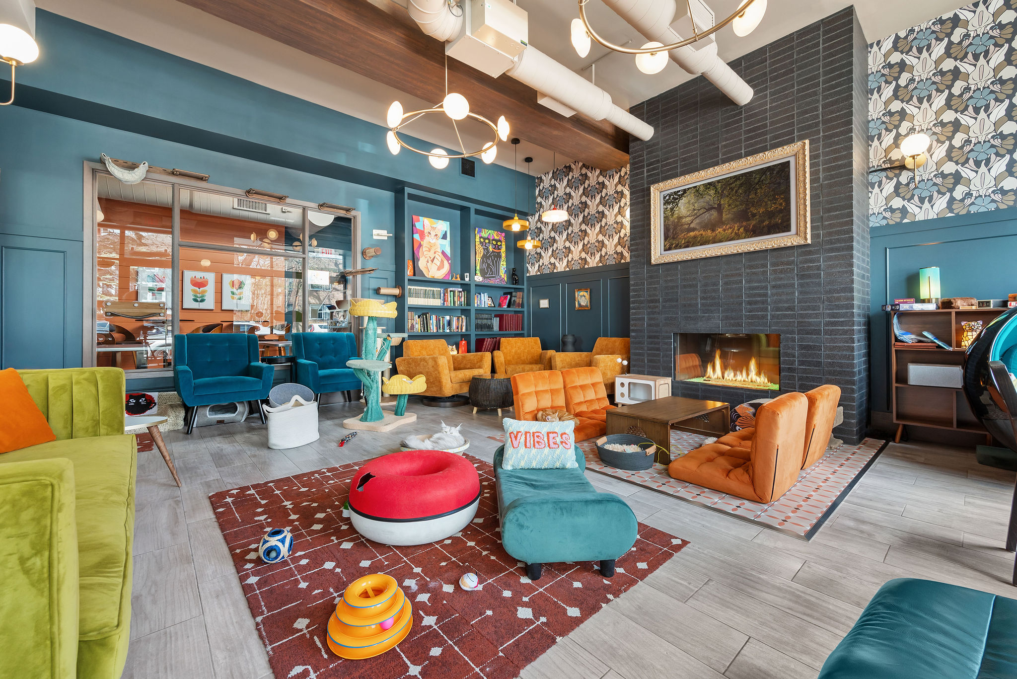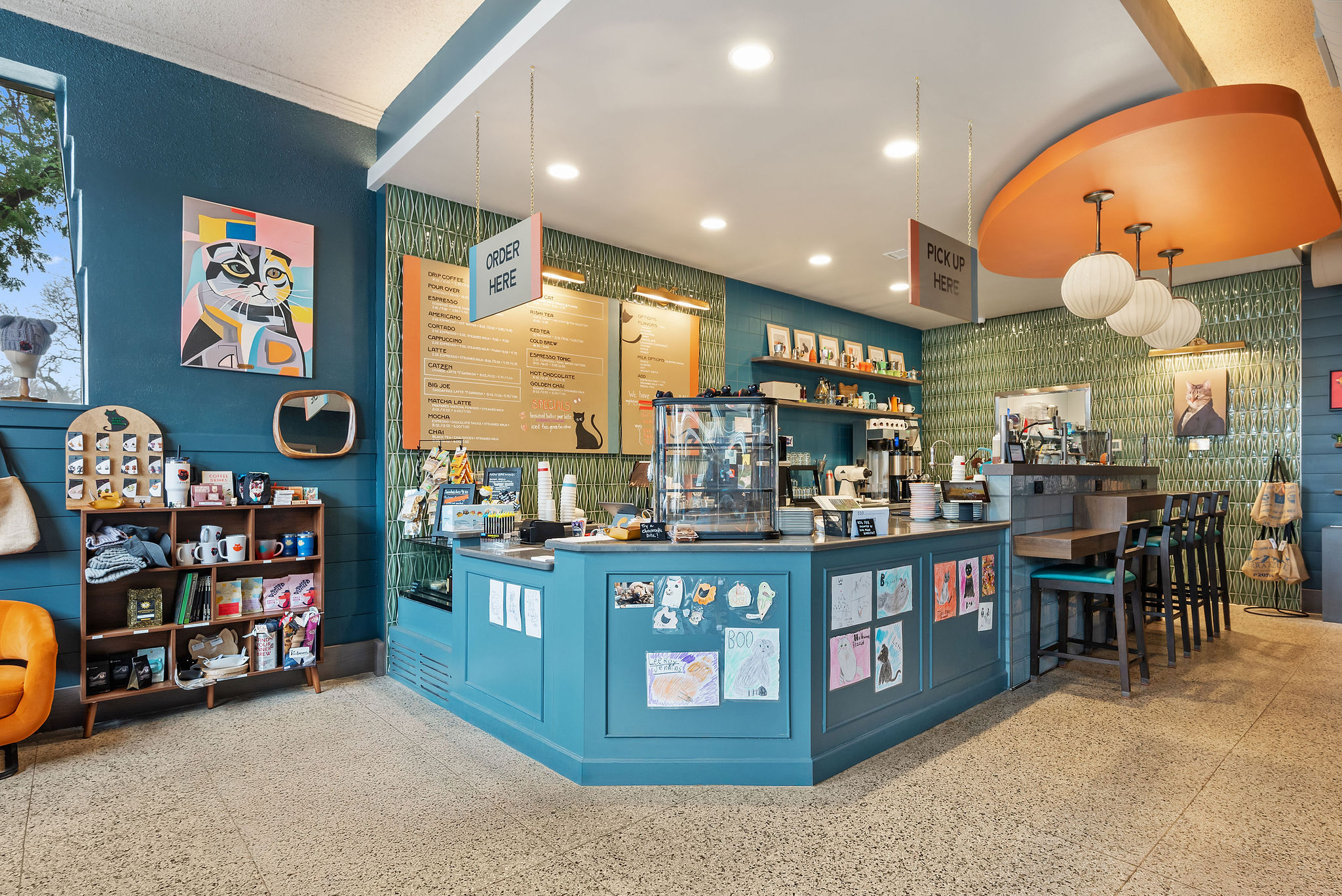 The interiors feature a mid-century inspired palette with lively tiles, warm tones, and playful colors, creating an atmosphere that feels both approachable and thoughtfully designed. Soft seating and durable surfaces strike the right balance between comfort for guests and functionality for the cats.