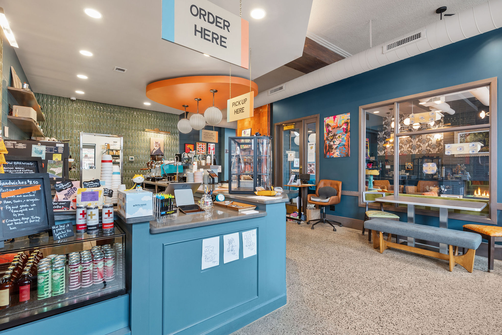The café was positioned as the welcoming centerpiece, with open views into the cat den. A custom bench at the entry cleverly integrates a passageway for cats, leading to the basement den and storage areas. Upstairs, a coffee lab was added to host classes and events while maintaining sightlines into the den.